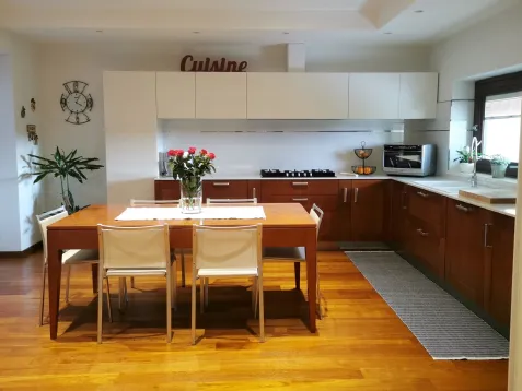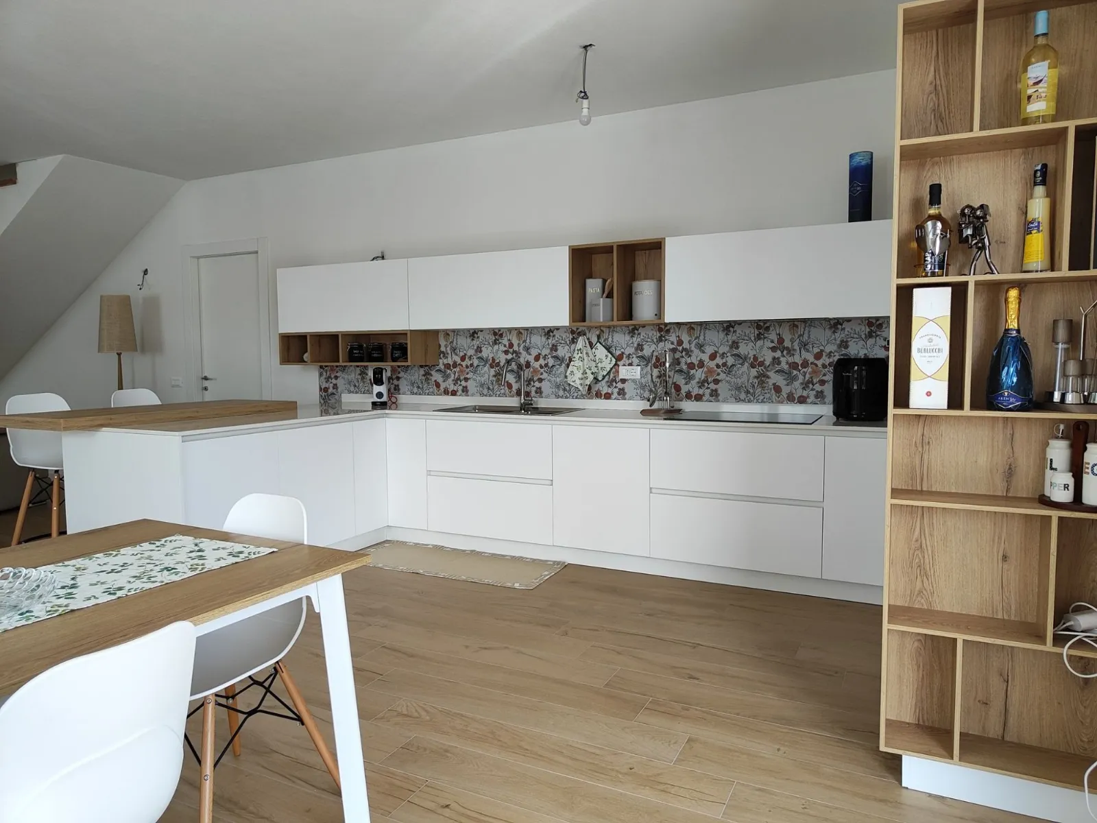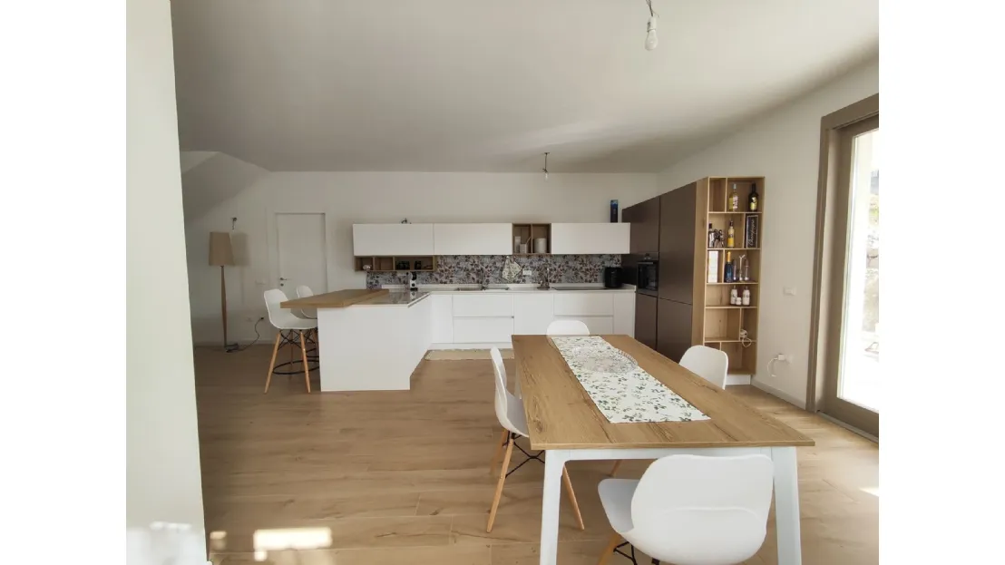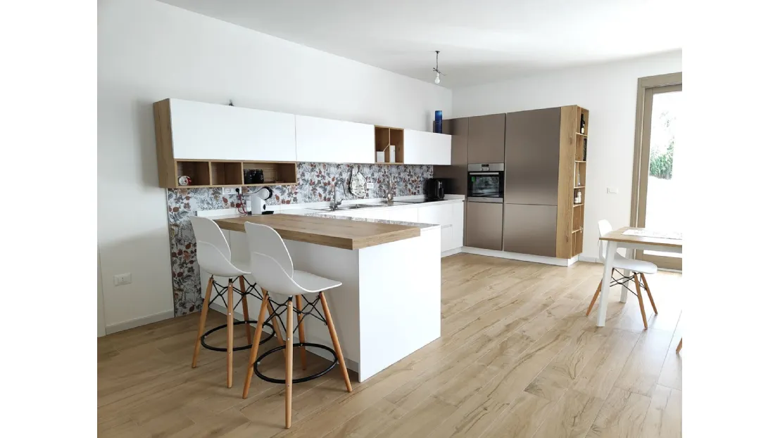 Una scelta moderna in linea con lo stile più amato del momento: la coppia total white col caldo colore del legno rovere. Cucina #Kalì del brand Arredo3 con piano in quarzo e colonne finitura bronzo che donano un tocco di unicità. Tavolo, sedie e sgabelli completano coerentemente l'ambiente.