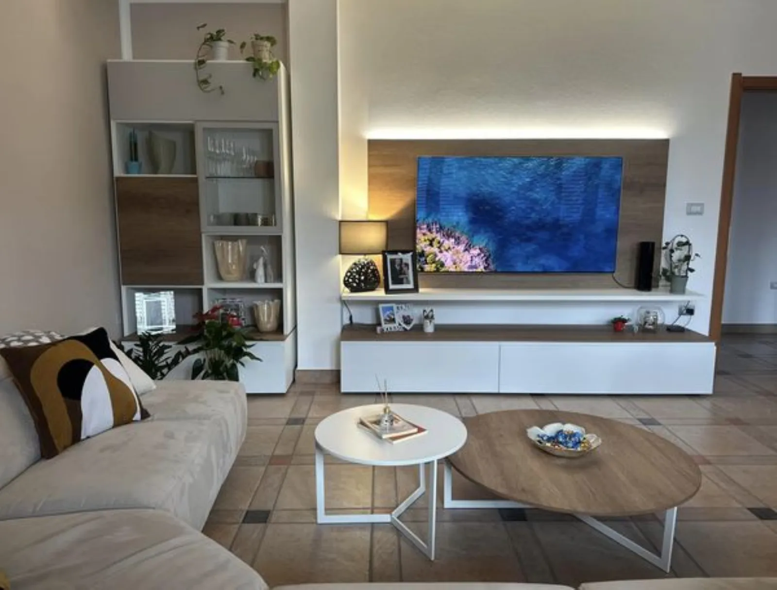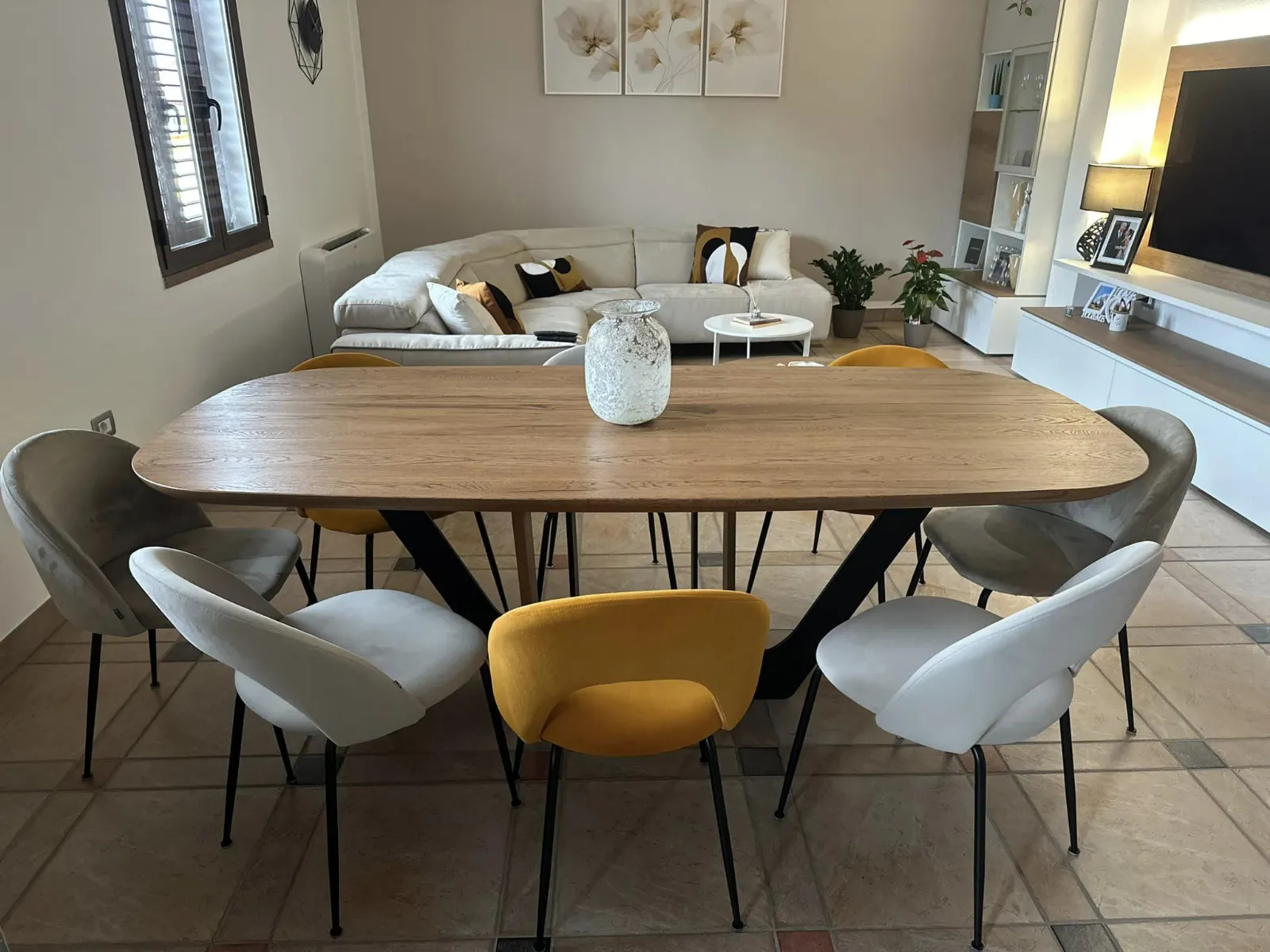 A casa di Roberto e Meri. Per loro abbiamo realizzato l’intera zona living. La parete si contraddistingue per l’imponenza del pannello retro TV insieme al modulo libreria alternato da vetrina ed elementi a giorno. Arredamento completato da un elegante divano firmato Egoitaliano in blush e dai due tavolini. La zona pranzo si arricchisce con iltavolo Cosmopolitan di DevinaNais. Piano ovale e basamento super moderno con un tocco di colore dato dallesedie senape e beige.