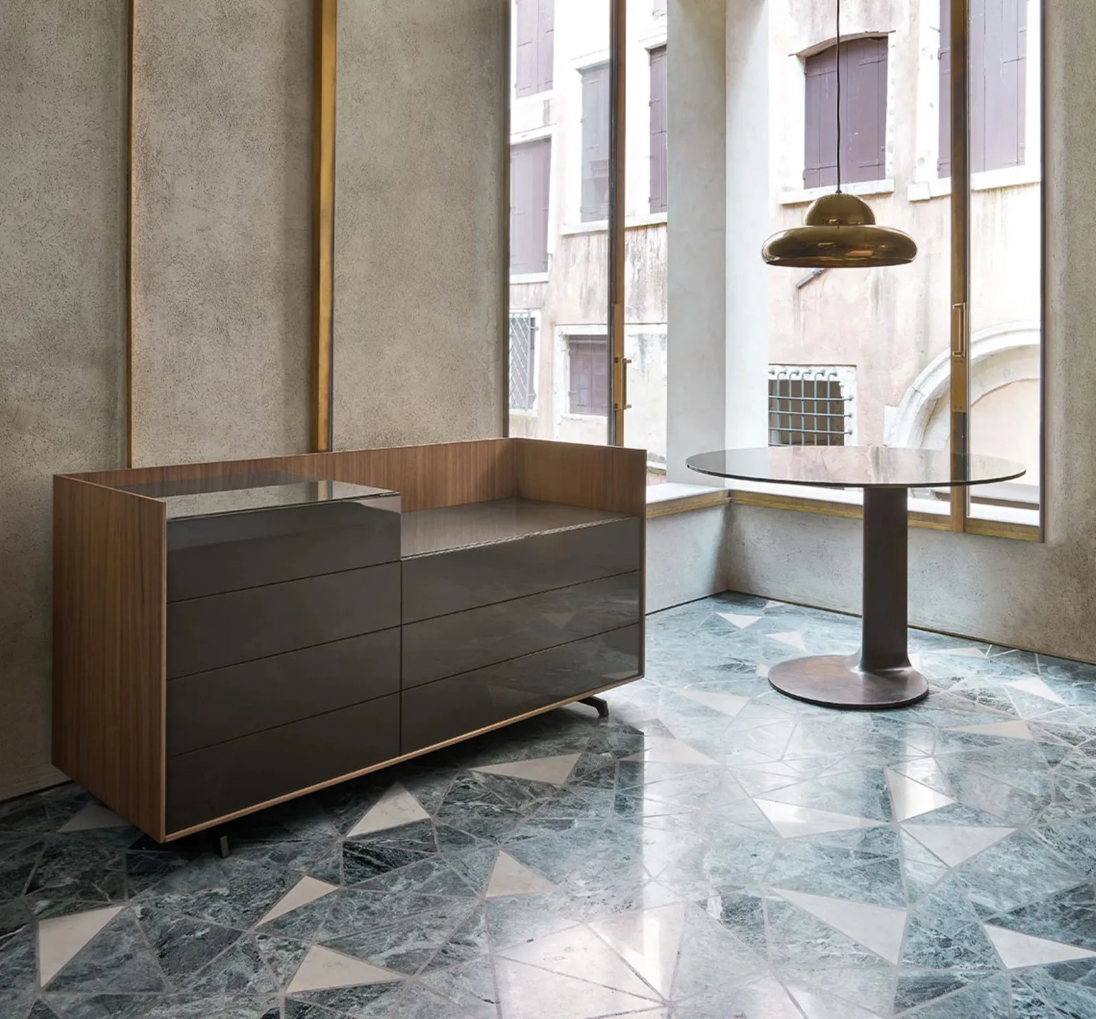 Vuoi allestire la zona notte con Comodini e cassettiere di Sangiacomo? Ecco qui il modello Cabaret Glass Comò in laccato lucido per spazi design.