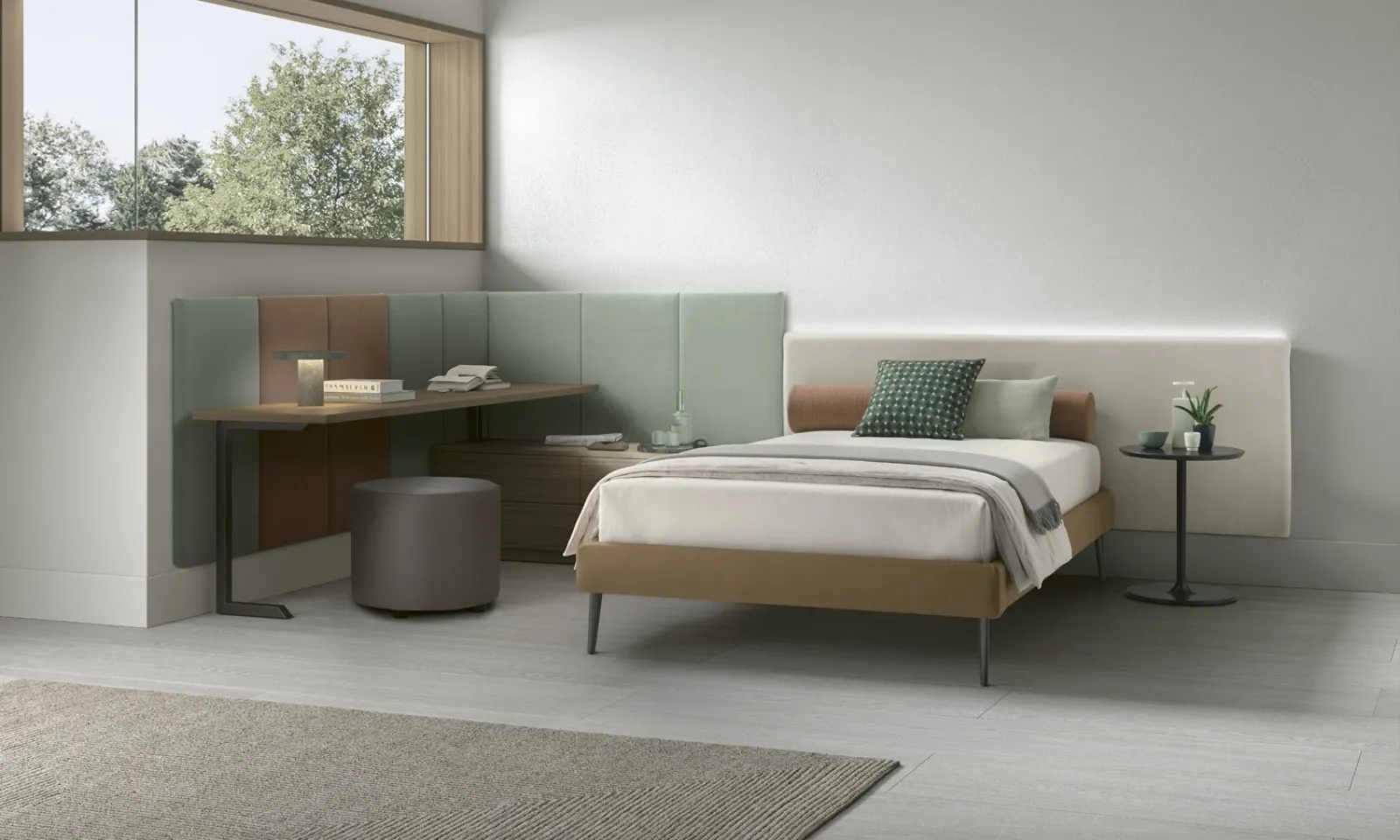 Il letto singolo Boiserie in tessuto nell'immagine, tra i modelli imbottiti moderni di V&Nice, è ideale per garantire il riposo migliore.