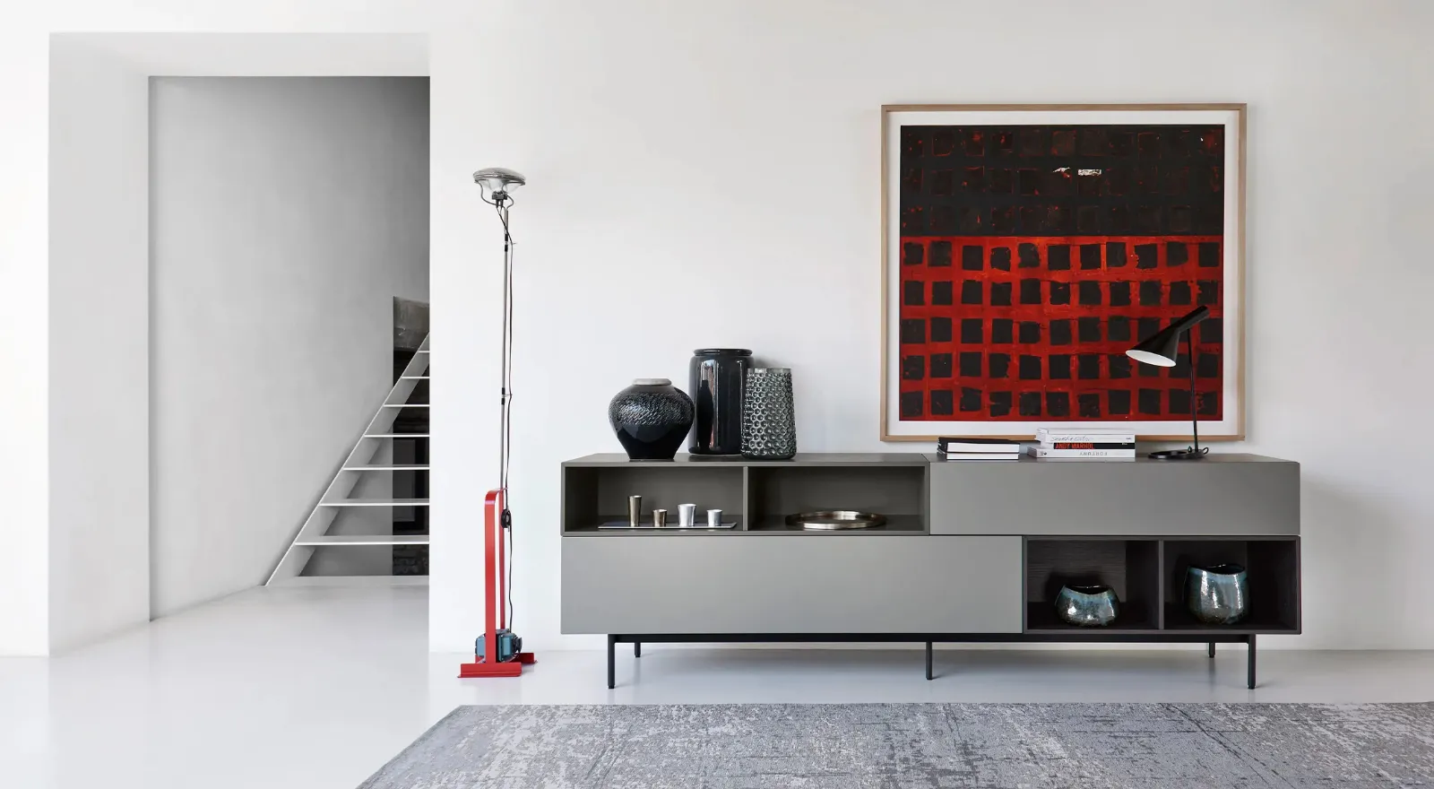Arreda un soggiorno operativo e pratico con questa madia Open 02 di Sangiacomo: scopri le più belle Madie in laccato opaco.