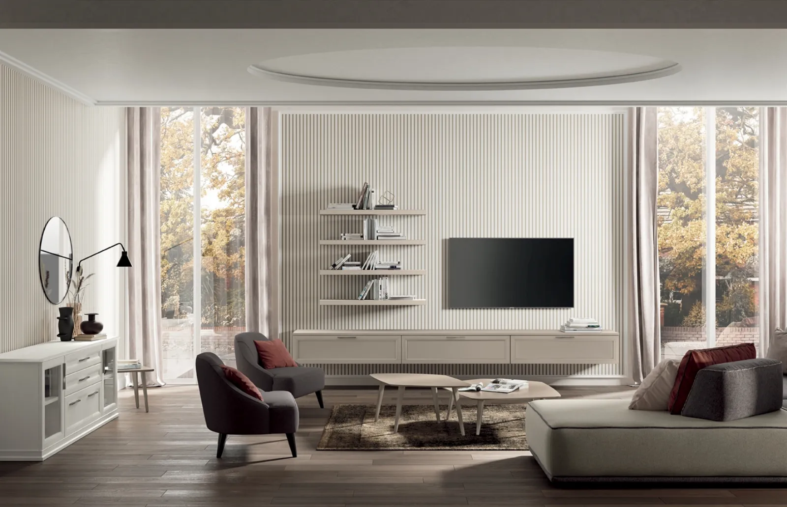 Se desideri completare un soggiorno pratico e operativo dalle linee classiche, ecco a te la parete attrezzata Arcadia AS009 Colombini Casa.